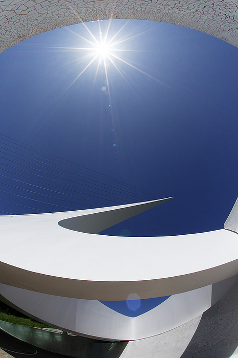 From an unconventional vantage point beneath the Sundial Bridge, and further enhanced through the eye of a fisheye lens, a brilliant sunstar casts it light onto the tower, throwing its shadow onto the time markers on dial below.