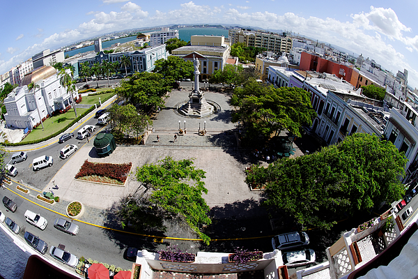 Old San Juan, Puerto Rico, is the second oldest city in the Western Hemisphere, founded by the Spanish in 1519. It's architecture reflects four-hundred years of development and includes Gothic, Renaissance, and Baroque styles. This fisheye lens view is from the Posada San Francisco hostel, looking over Plaza de Colon.
