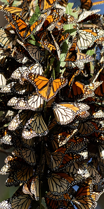 Over 20,000 Monarch Butterflies call Pismo Beach their winter home each October through February. The butterflies cluster in groups like this, layering their wings like shingles as they hang from the eucalyptus trees to protect each other from rain and and keep each other warm. The butterflies of Pismo Beach are an unusual variety. While most Monarchs live only six weeks, these Monarchs have a unique way of storing fat that lets them live six months.