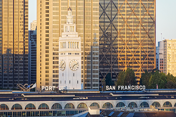 The evening sunset lights the buildings of San Francisco's financial district gold behind the Ferry Building.