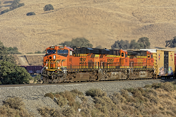 Three locomotives pull a BNSF freight train up the steep grade between Bakersfield and Tehachapi. On this line, another set of engines usually pushes from the rear, and sometimes another set is even helping along mid-train.